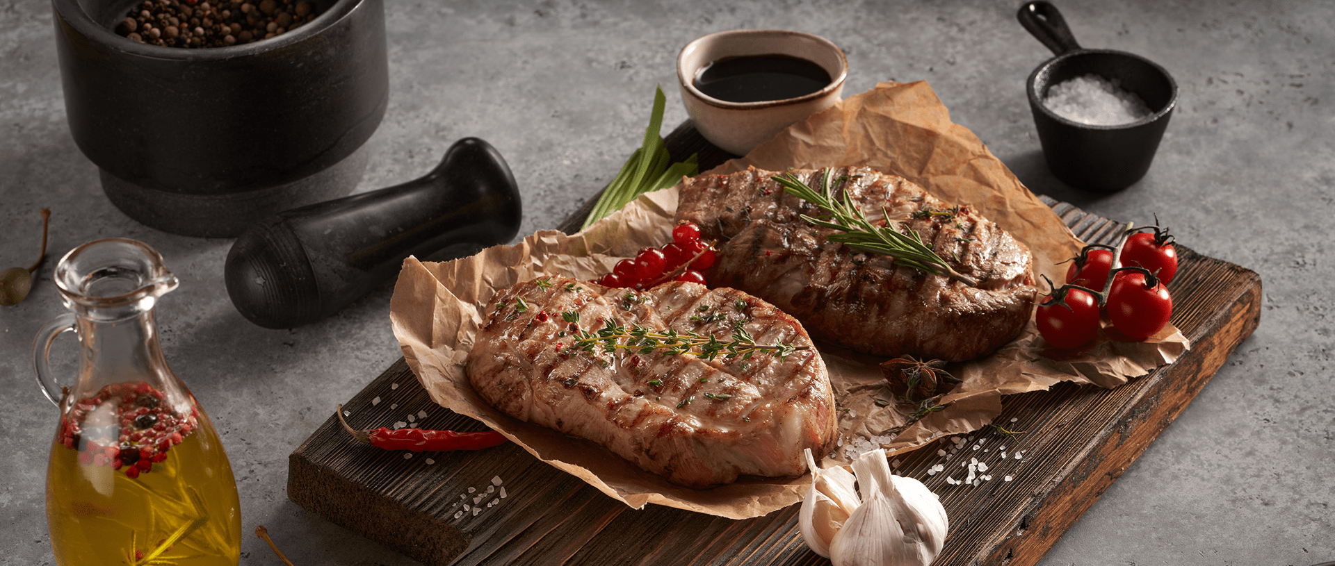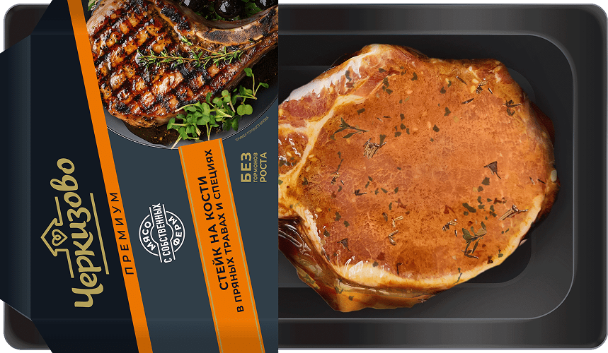 Вторая новинка в соусе — стейк «Черкизово Премиум» из свиной корейки с косточкой. Толщина продукта составляет около 2,5 см. Он содержит тонкий слой шпика по краю, что обеспечивает хорошую прожарку блюду и сохраняет необходимую сочность мяса.