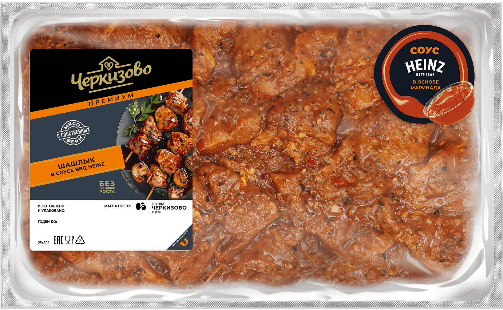 Шашлык «Черкизово Премиум» в умеренно пряном соусе барбекю от Heinz — это предложение для большой компании: 2 кг отборного окорока, порезанного на кусочки оптимального для жарки размера и упакованного в вакуумный пакет.